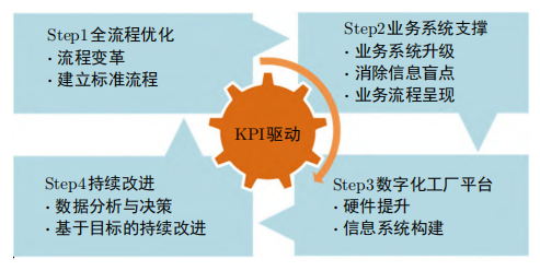 企业的关键绩效指标(KPI)也是数字化转型过程的核心驱动力。KPI可以客观、有效地衡量数字化工厂建设中的因素和变化,将精力从无关紧要的琐事中解脱出来,着重关注数字化工厂实现过程中的关键改善方向,提升改进效果。数字化工厂实现的逻辑与实施可以简单分为4个步骤,如图1所示。
