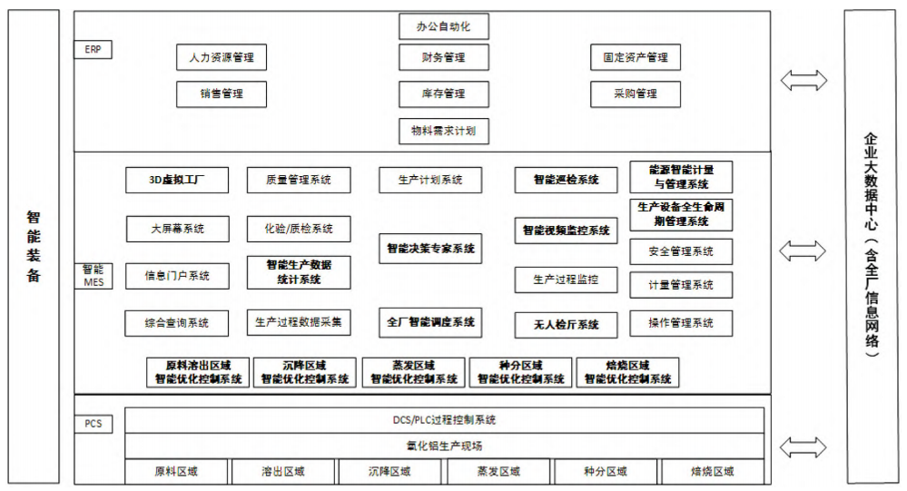 (3)开发基于智能决策的氧化铝智能管控系统,将传统的MES升级为智能MES,生产计划、调度均建立模型,实现生产模型化分析决策、过程量化管理、成本和质量动态跟踪以及从原材料到产成品的一体化协同优化。建立企业资源计划系统(ERP),实现企业经营、管理和决策的智能优化。