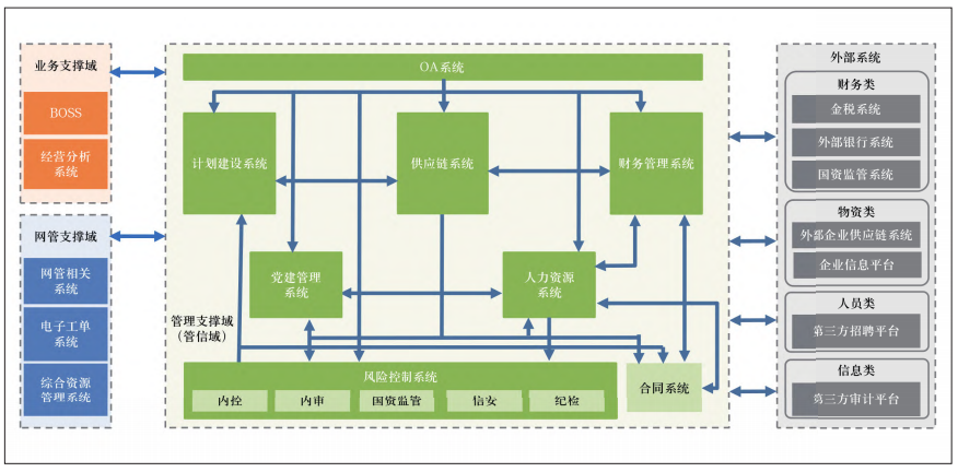 如图 1 所示,管理支撑业务具有横向贯穿、条线管理和业态丰富的业务特点。例如工程项目流程涉及计划、采购、工建和财务等多个横向部门,业务流程横跨计划建设、OA、供应链、财务管理和内部审计等系统。