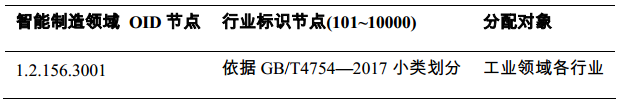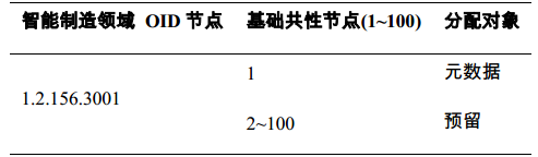 智能制造领域OID节点编码是由智能制造对象标识顶级运营机构向国家OID注册中心注册,由国家OID注册中心统一分配,其数字值为1.2.156.3001,其业务范围是为智能制造领域的各类对象进行规范的标识解析,统一管理。下一级节点编码由智能制造标识运营机构规划,分配方案见表1。