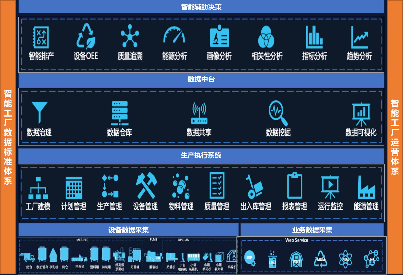 基于“数字工厂平台DPP”,智通云联提供了是以乳品生产过程为建设核心,通过数据采集平台与相关设备及系统集成,实现了设备互联、系统互通,从而实现生产、质量、设备、成本智能化协同管理,打造了智能制造新模式工厂。