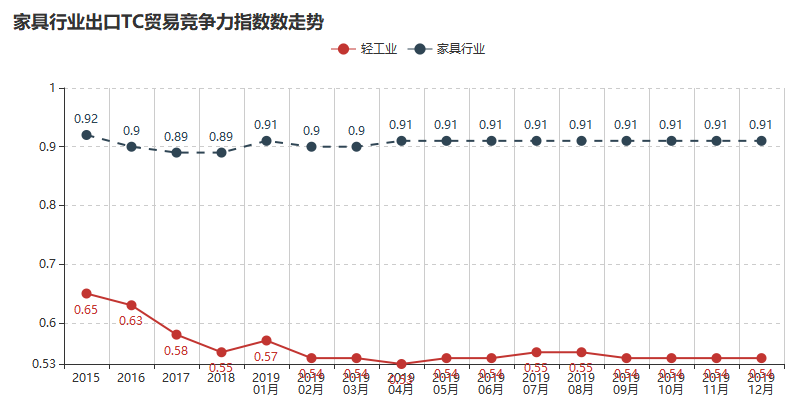 2019年12月家具行业贸易竞争力指数0.91