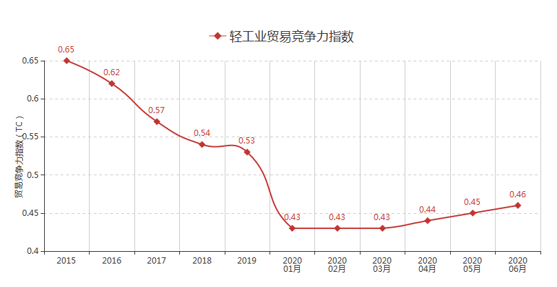 2020年6月中国轻工业贸易竞争力指数为0.46