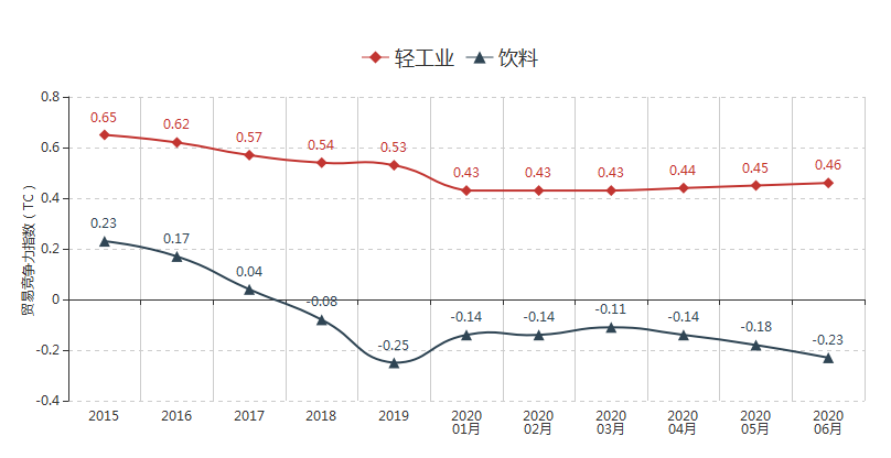 2020年6月饮料酒行业贸易竞争力指数-0.23