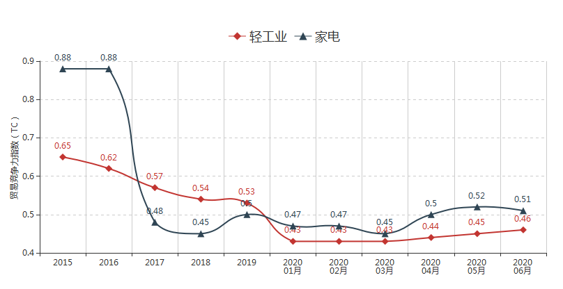 2015年以来,由于国内家电消费升级,进口家电需求大幅增加,家电行业TC贸易竞争力指数有较大幅度回落。2019年该指数较2015年下降0.33点至0.50;受疫情影响,2020年该指数先降后升:3月该指数为0.45,较2019年末小幅下降0.05点;6月该指数较3月回升0.06点至0.51,比同期轻工业平均贸易竞争力指数高0.05点。