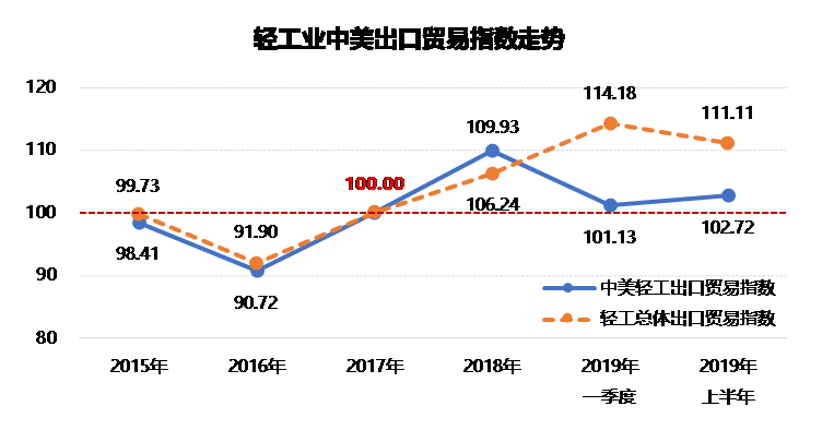 2019年上半年 对美国累计出口额为670.8亿美元。从指数走势看,轻工总体出口贸易指数在基准年2017年以前在临界值100以下,2017年以后持续在100点以上运行,且在2019年以来较2018年有所上升,表明轻工业总体出口形势平稳向好。由于“抢出口”效应影响,2018年轻工中美出口贸易指数冲高至109.93,高于轻工总体出口贸易指数。但2019年以来轻工中美出口贸易指数较2018年有较大幅度回落。2019年上半年,轻工业中美出口贸易指数102.72,较2018年末下降7.21点,比同期轻工总体出口贸易指数低8.39点。