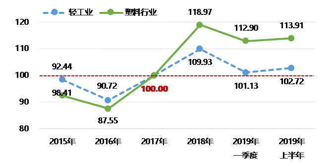 2019年上半年塑料制品行业对美累计出口额为80.87亿美元。塑料制品行业中美出口贸易指数在2018年以来呈高位小幅回落走势,2019年上半年仍保持113.91的相对高位,比同期轻工业中美出口贸易指数高11.19点,中美经贸摩擦对行业对美国出口影响有限。
