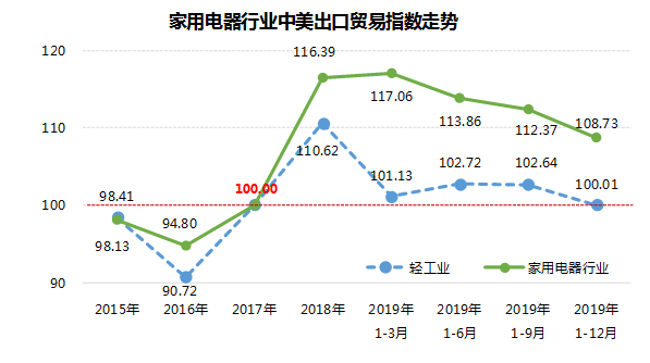 2019年1-12月家电行业中美出口贸易指数108.73