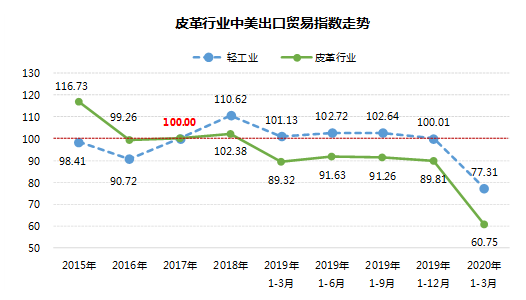 2020年1-3月皮革行业中美出口贸易指数60.75