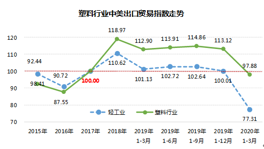 2020年1-3月塑料行业中美出口贸易指数97.88
