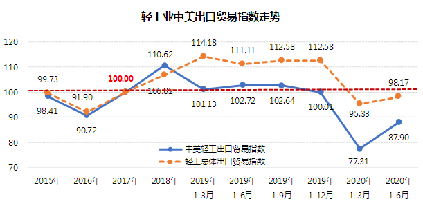 2020年1-6月轻工中美出口贸易指数87.90
