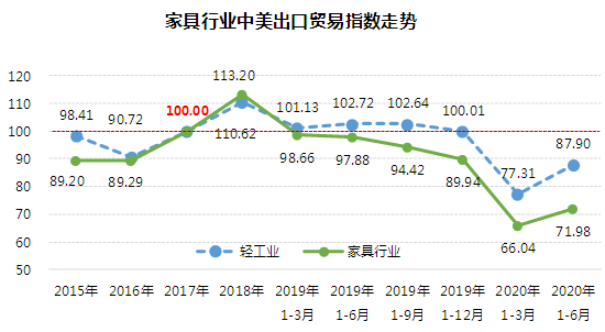 2017年,家具行业对美国累计出口额为187.6亿美元,2018年为212.4亿美元,2020年上半年为66.3亿美元。家具行业中美出口贸易指数走势显示,2018年由于“抢出口”效应刺激达到近年峰值,2019年开始跌落至基准值以下,行业对美出口形势持续走低。受疫情影响,2020年一季度家具行业中美出口贸易指数较上年末大度下降23.9点;二季度,家具行业对美国出口弱势改善,1-6月中美出口贸易指数较1-3月回升5.94点至71.98,仍低于同期轻工业平均指数15.92点。
