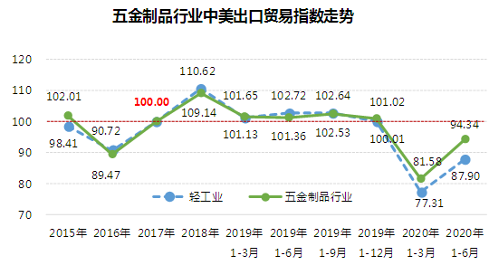 2020年1-6月五金行业中美出口贸易指数94.34