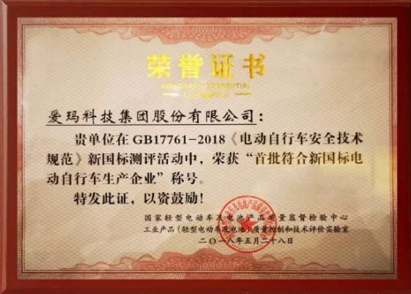 图注:爱玛获新国标荣誉证书