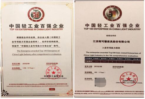 斯可馨家居再度上榜“中国轻工业百强企业”