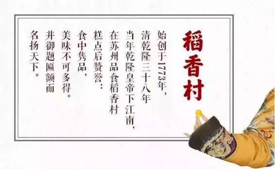稻香村创始于清乾隆三十八年,即公元1773年。乾隆南巡到苏州观前街,品尝了稻香村店内的蜜糕,赞其“食中隽品,美味不可多得”,特御赐一块葫芦招牌,上写“稻香村”三个大字,字体飞金,稻香村就此名扬天下。