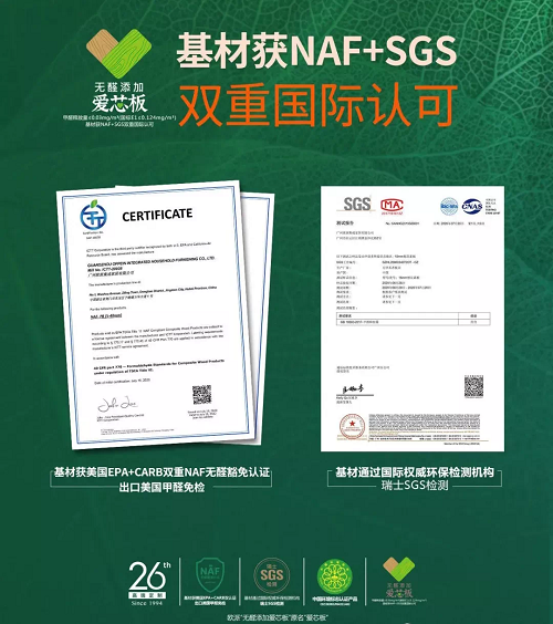 凭借出色的环保性能,欧派无醛添加爱芯板不仅获得了CARB NAF+EPA NAF双重权威认证,更获得NAF+SGS双重国际认可。经国家人造板与木竹制品质量监督检验中心检测,欧派无醛添加爱芯板的甲醛释放量甚至低于0.005mg/m³,趋近于0,**行业。