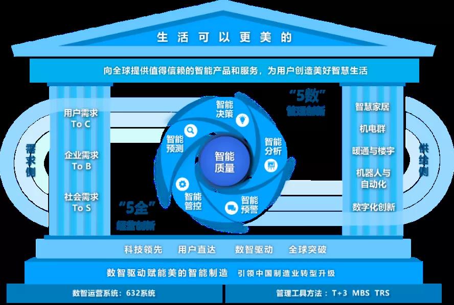 美的通过数字化智能运营系统和创新管理工具方法,围绕“科技领先、用户直达、数智驱动、全球突破”四大战略主轴,坚持以用户为中心,通过“5全5数”智能质量管理模式,“打通”供需两侧,实现端到端全价值链业务场景的智能分析、智能预警、智能管控、智能预测和智能决策。