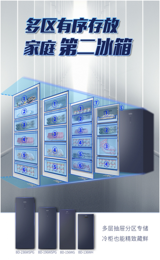 冷柜产品由粗放的囤货转为更科学的精细化存储,规整有序的分区储存替代无序的乱码堆积、用无霜健康的小环境规避细菌滋生的大隐患、用站立取物来减少弯腰翻找的不便等。推出小巧机身不占地、多层抽屉分区专储的立式冷柜,实现了冷柜也能精致藏鲜的要求。