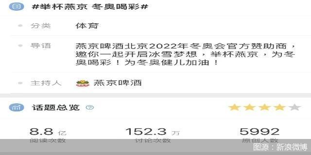 数据显示,“让冬奥赛场响起你的加油声”活动有近336万人参与其中;燕京啤酒冬奥“喝彩”活动有超151万网友参与。截至目前,#举杯燕京 冬奥喝彩#新浪微博话题阅读量更是早已超过8.8亿次。