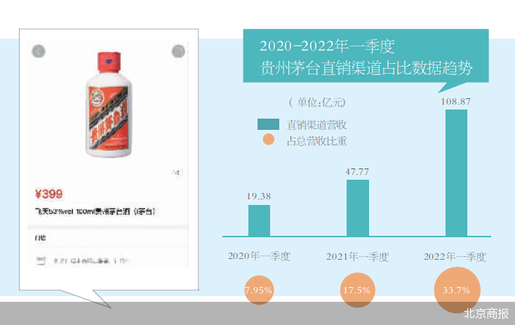 掀开i茅台正式上线与“变装茅台”登上i茅台事件帷幕,直销渠道在贵州茅台销售渠道占比中越来越重。数据显示,2022年一季度,贵州茅台直销渠道实现收入约108.87亿元,同比增长127.88%。直销渠道营收占总营收比重超33%,相比2021年年报中的22.7%上涨近10个百分点,相比上年同期17.5%上涨15.5个百分点。