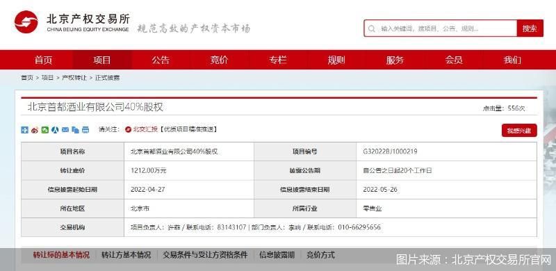 根据北京产权交易所官网披露的转让信息,此次转股的转让方为北控京泰,为首都酒业第二大股东,转让股权数量为北控京泰持有的全部首都酒业40%股权,转让底价为1212万元 ,价款支付方式为一次性支付。
