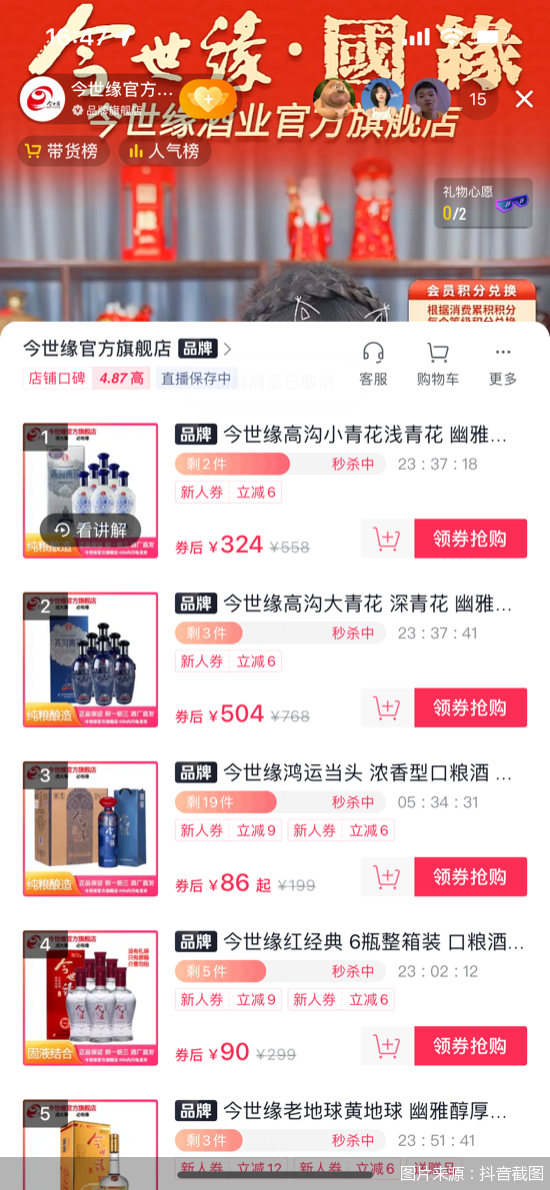北京商报记者通过抖音平台发现,诸多酒企均在抖音平台开启过直播带货。从直播形势来看,酒企直播基本都是用价格优势吸引消费者。以今世缘官方旗舰店直播为例,42度500ml*6瓶装今世缘高沟小青花原价标558元/箱,直播间价格仅为330元/箱,领券后仅需324元。直播画面中张贴着“惊爆价”字样的提示牌。