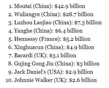 “50大烈酒品牌”(Spirits 50)总价值1426亿美元,中国10个品牌上榜,价值976亿美元,占比68.4%。茅台、五粮液、泸州老窖、洋河包揽前四名。