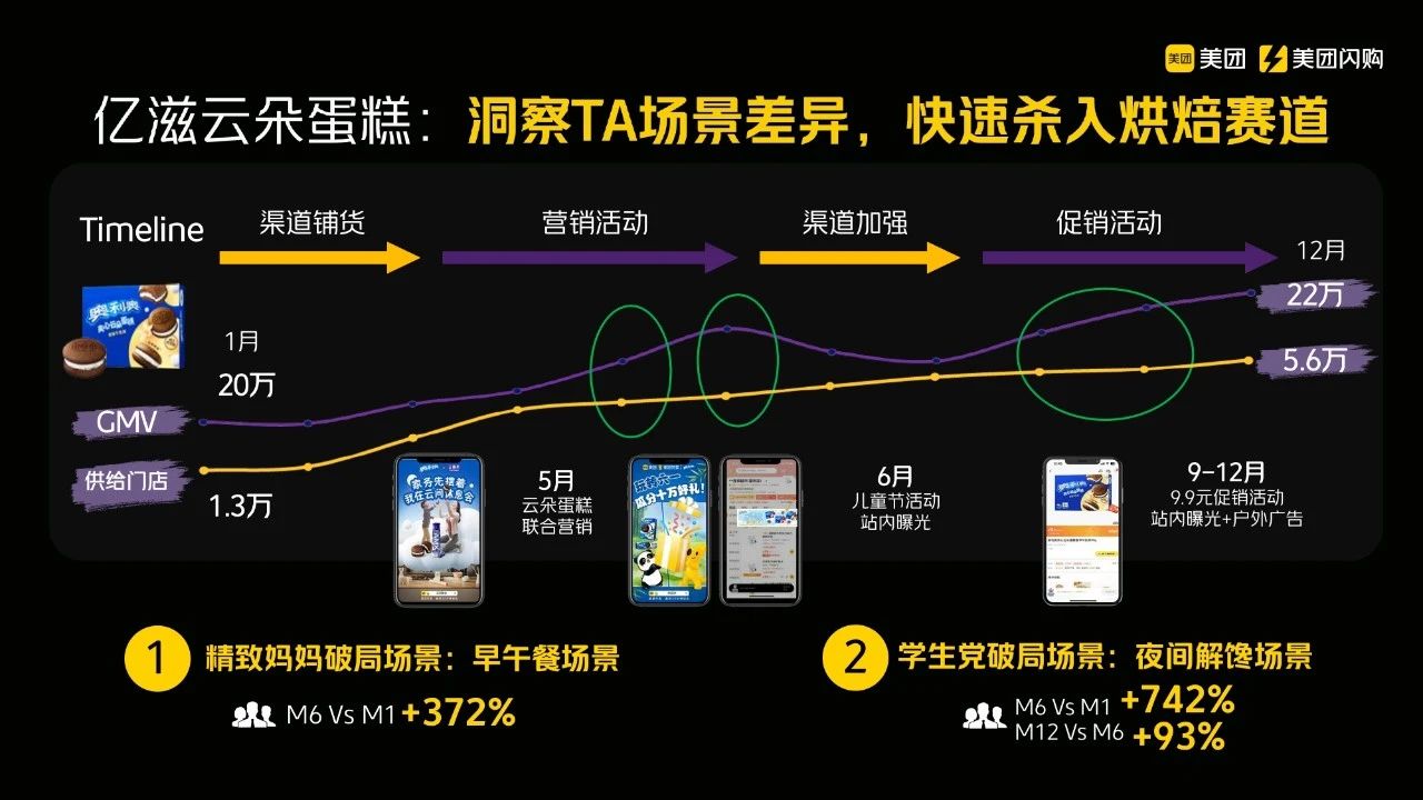 然而,经过一段时间的营销活动,我们发现另一个意想不到的消费群体也在快速增长,并占据了很大的市场份额——学生群体。通过快速调整策略,我们发现学生群体的关键消费场景是夜间解馋。对于年轻人而言,夜晚才是一天的真正开始,白天不属于他们。因此,我们迅速在夜间解馋场景中定位学生群体,结果发现其增长速度甚至超过了预期的“精致妈妈”群体。