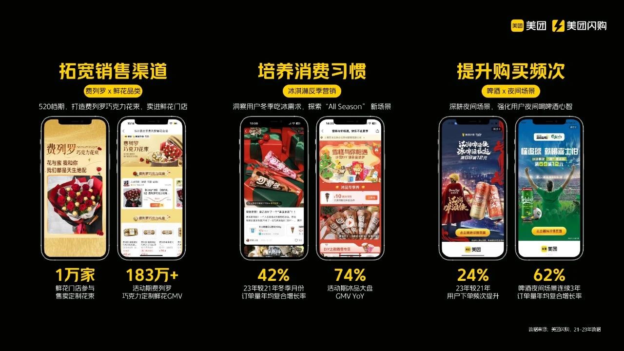 第三个案例关于如何提升用户的购买频次,这就不得不提到啤酒品类。近年来,尤其是在欧洲杯等球赛期间,夜间的啤酒销量非常好。三年前,我们可能还不敢如此大胆地进行营销推广。那时,用户在夏季想购买冰啤酒时,平台上的商品供应和24小时营业的店家数量都不足。然而,过去三四年间,我们一直在努力推动这一领域的发展,确保更多冰啤酒商家的入驻和24小时营业门店的增加,以便更多人在夜间想喝酒时能够随时随地买到。