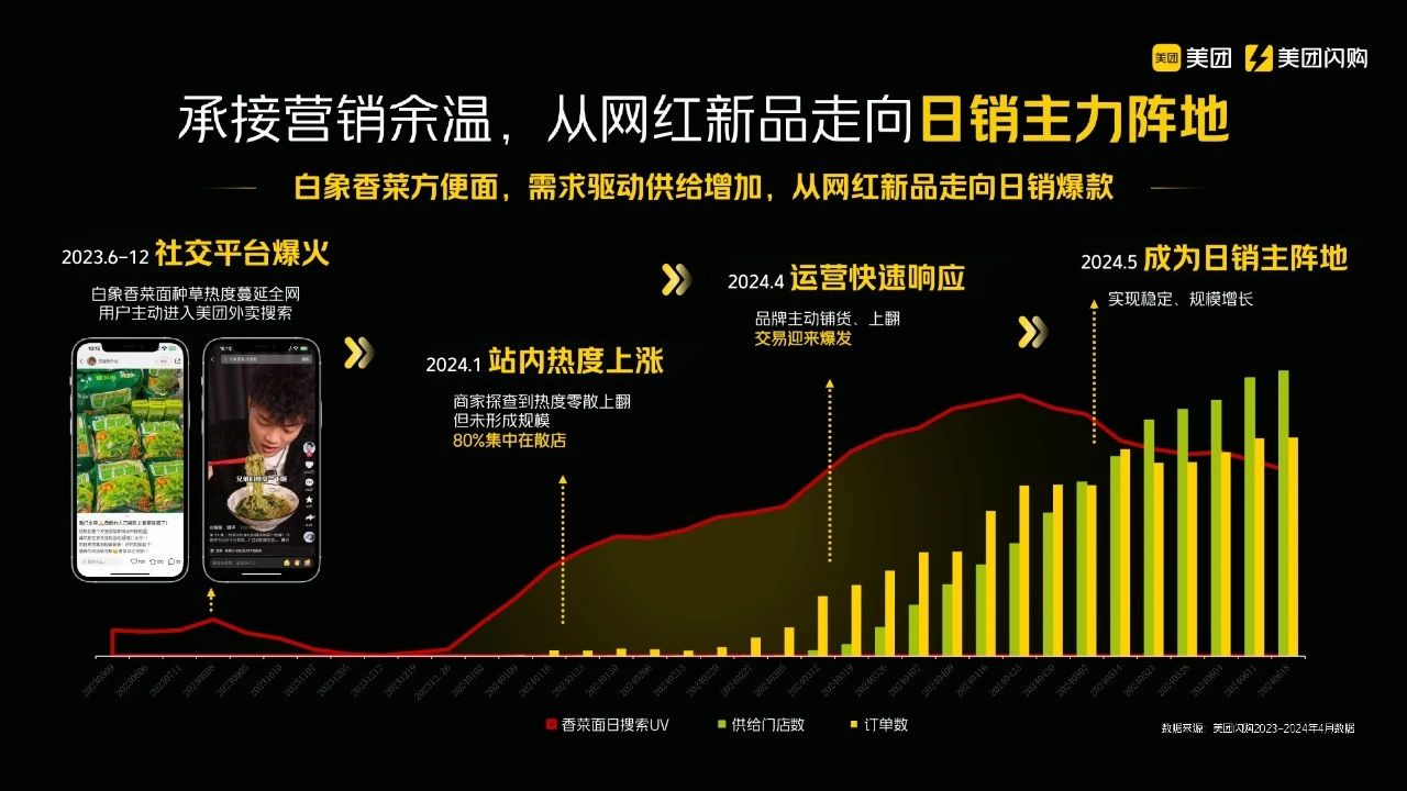 在今年做FBIF活动评委经历中,我遇到了一个很有趣的案例,就是白象方便面的例子。这个案例融合了不同平台的实例。去年大家是否有注意到白象方便面的广告?我当时在小红书上看到了这个产品,心想我们平台上有没有卖这个呢?但当我进行搜索时,并没有找到相关商品。我看到这个案例后,发现我们平台的数据非常有趣。红色线代表的是香菜方便面在我们平台的搜索量。在2023年下半年,白象开始推广香菜方便面,用户在我们平台上开始搜索,但由于没有供应,绿色柱形图显示供应门店的数量一度为零,用户的需求未能得到满足。