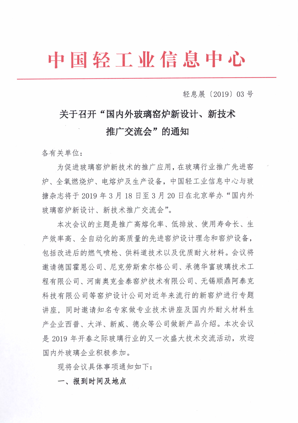 关于召开“国内外玻璃窑炉新设计、新技术推广交流会”的通知