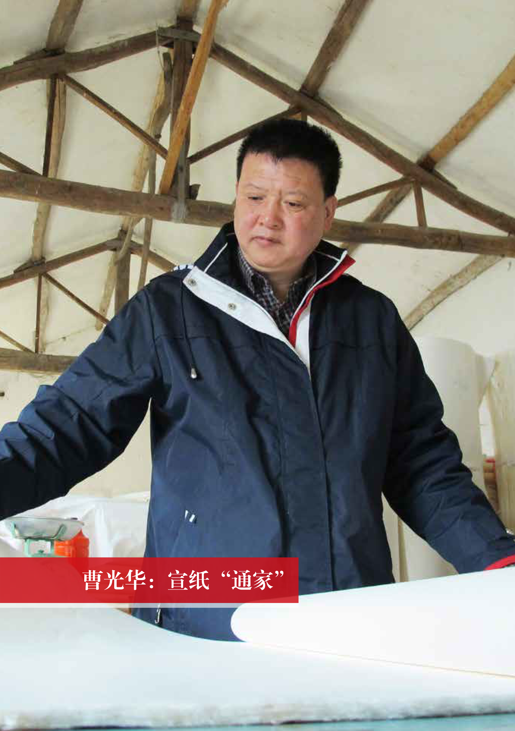曹光华出生于 1954 年,自幼生活在小岭。小岭人的造纸盛况,正如清朝当地的读书人描述的一样:“沿溪纸碓无停歇,一片舂声撼夕阳。”家家户户都干这一行。纸乡从收购稻草、青檀皮,到制作燎草、燎皮,以及捞纸、晒纸的整个过程,曹光华都有幸见证。皮草从挑上山到挑下山,少则十个月,多则一两年,期间要不断翻晒;寒冬腊月,抄纸工夜里两三点就要起床,进入四面透风的槽坊,用双手从冰寒刺骨的浆水里,抄捞出一张张宣纸;夏天,晒纸屋里的气温接近 80 摄氏度,工人成天在烘墙上贴纸、揭纸,热得身上只留遮羞布;鞭草房里尘土飞扬,令人窒息,纸工出草房时,只能看见两只白眼球和两个鼻孔;舂碓屋里打草、打皮的巨响,影响工人的听力,有的几代人都是“板聋子”……推行计划生育政策之后,独生子女越来越多,很多家长宁愿让孩子出门打工,也不愿意将孩子送进宣纸厂。所有这些,曹光华看在眼里,疼在心里,急在心里!