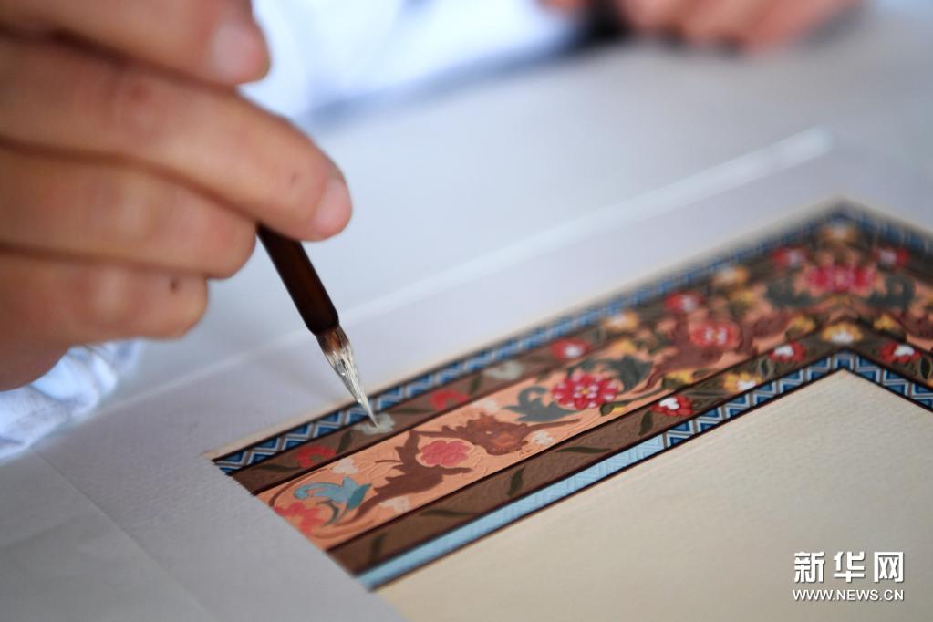 黄晶蓉在画板上给天水丝毯的设计小稿上色