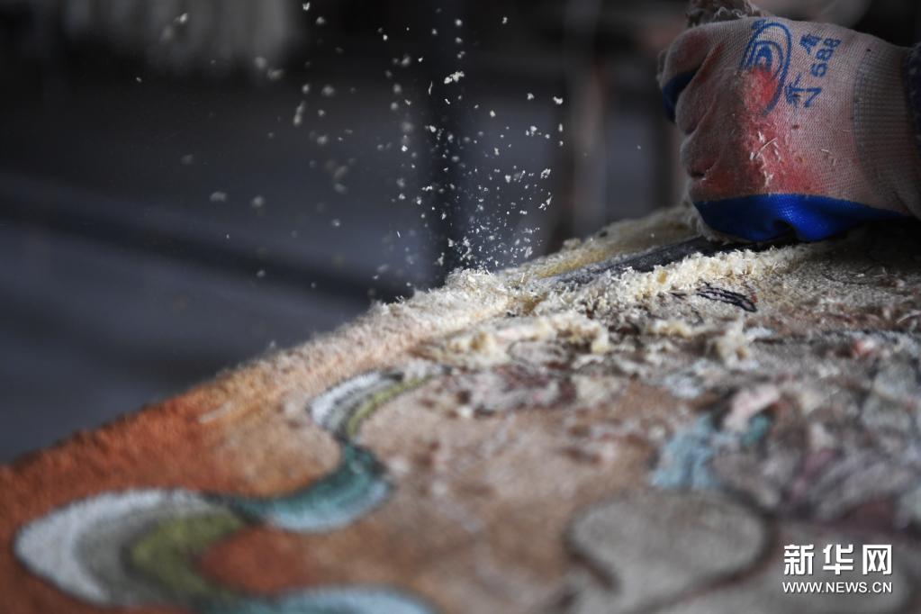 天水丝毯的织造工人进行丝毯的平整工作