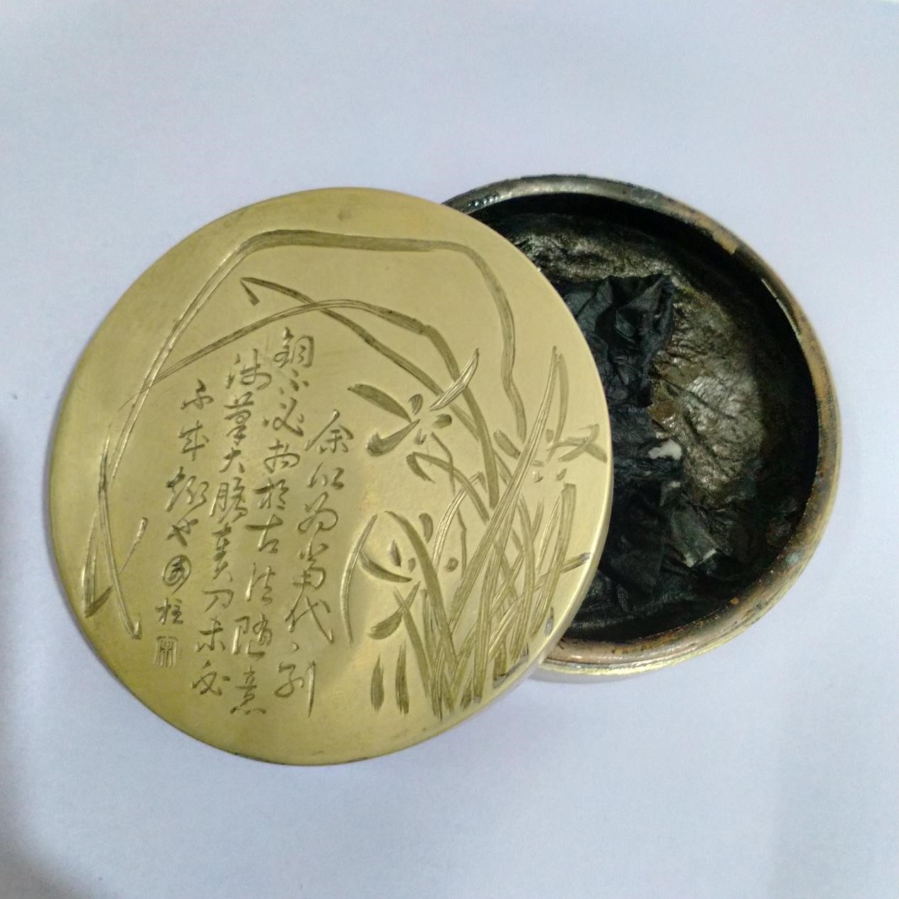肖爱国制作的圆形铜墨盒经雕刻师宋国柱加工后的效果展示
