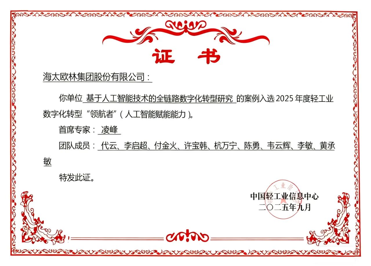 大会发布了2025年度轻工业数字化转型“领航者”案例名单。人工智能赋能、数据要素赋能、工业互联网建设、先进技术研发应用等110项案例入选。海太欧林集团与海尔智家、伊利乳业、蒙牛乳业、纳爱斯集团、洋河股份等企业榜上有名。集团 “基于人工智能技术的全链路数字化转型研究”案例入选2025年度轻工业数字化转型“领航者”,成为商用空间解决方案领域数字化转型的典范。