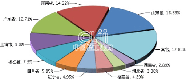 1~8月,家具行业累计利润居全国前十位地区的排名保持不变,依次是山东占16.59%,河南占14.22%,广东占12.71%,上海占9.30%,浙江占7.90%,四川占5.85%,辽宁占4.95%,福建占4.39%,河北占3.38%,湖南占2.89%(图6)。与1~7月相比,上述地区中前8个地区的各自占比均有所收窄。