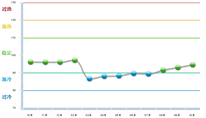 图3 2012.9----2013.10月工艺美术主营业务收入景气指数变化态势