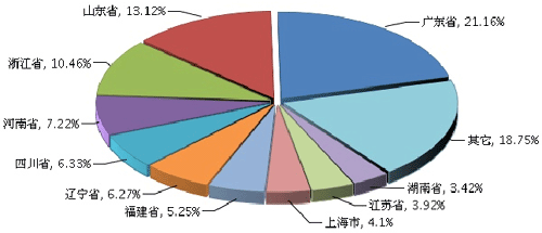 图6 2013年1~10月主要地区家具行业规模以上企业累计主营业务收入占比情况