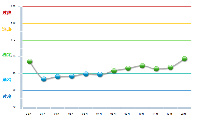 2013年12月至2014年2月中轻工艺美术景气指数处于基本稳定状态。与2013年2月同期比较略有下降,2014年2月份中轻工艺美术景气指数与2013年12月份相比下降近2点。(参见图2