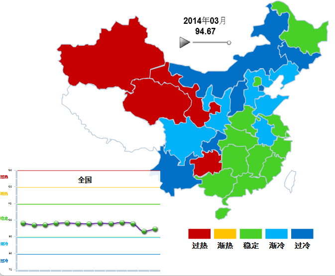 从分地区五金行业景气指数看,与2014年2月份相比:处于“过热”区域的地区有所增加,除青海和贵州两地区继续处于“过热”区外,甘肃和新疆也加入了此区域;吉林、内蒙、山西、重庆、云南几地区都处于“过冷”区,“过冷”区明显分布在我国中西部地区;宁夏、甘肃、四川、安徽、河北、山东和辽宁七地区处于“渐冷”区;此外,其它大部分地区均处于“稳定”区,此区域主要集中在我国东部地区(如图)。
