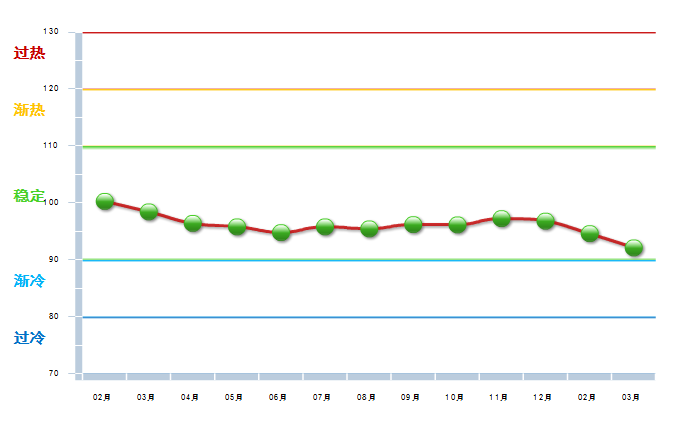 图2 2013.2----2014.3月工艺美术行业景气指数变化态势