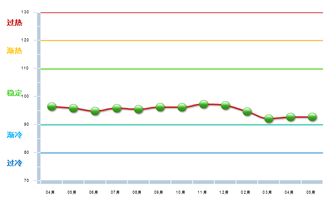 2013年4月至2014年5月中轻工艺美术景气指数处于基本稳定状态。与2013年4月同期比较略有下降,2014年5月份中轻工艺美术景气指数与2014年4月份相比基本持平。(参见图2)