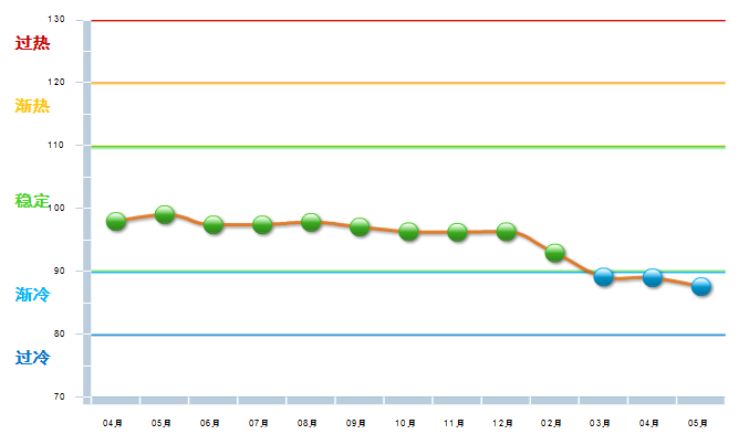2014年4月至2014年5月工艺美术主营业务收入指数继续呈现下降走势,连续三个月在渐冷运行区间。2014年5月工艺美术主营业务收入指数为87.57。(参见图3)
