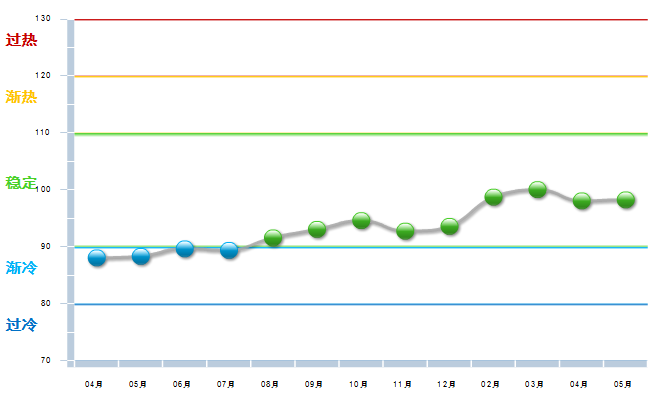 图2 2013.4----2014.5月工艺美术行业景气指数变化态势