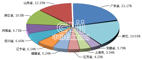 1~7月,家具行业累计主营业务收入居全国前10位地区的累计主营业务收入合计占比达到了80.99%,除了河南超过四川成为第四位以外,其他8个地区的位次与1~6月相同。前三位地区中,广东的累计主营业务收入(下同)占21.17%,山东占12.33%,浙江占10.80%(图6)。