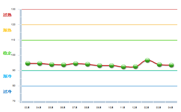 “稳定”区域依旧主要集中在我国的东部地区,包括北京、山东、江苏、浙江、福建、广东、云南七个地区,上月处于“稳定”区域的湖北和陕西这两地区本月均转为“渐冷”区域。4月处于“稳定”区域的地区总数量较2015年3月份减少了一个。