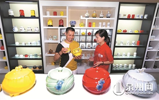 青花茶叶罐、大红釉茶叶罐、窑变茶叶罐、青瓷茶叶罐、汝窑茶叶罐……只要你能说得出的陶瓷茶叶罐,来到德化鼎艺礼瓷公司,你基本都能找得到。经常来这里订制陶瓷茶叶罐的老陈对记者说:“陶瓷茶叶罐不但装茶叶能防潮,还让茶叶原味持续保持清香。一包茶叶装在陶瓷罐里,一下子提高了送礼的档次。今年中秋,我已经订制一整箱陶瓷茶叶罐送给周边的亲朋好友,特有面子。”