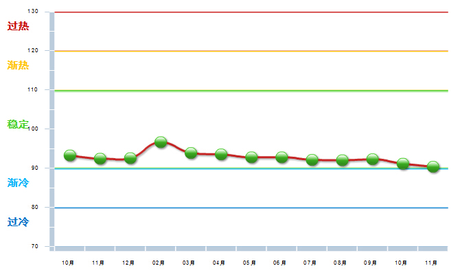 11月,只有贵州一个地区处于“过热”区域,云南一地区处于 “渐热”区域。处于“稳定”区域的地区数目有所增加,由上月的三个地区增加为陕西、天津、上海、福建和广东五个地区。